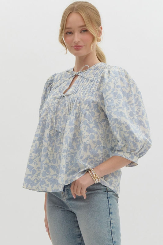 FLORAL PRINT PUFF SLEEVE TOP - BLUE