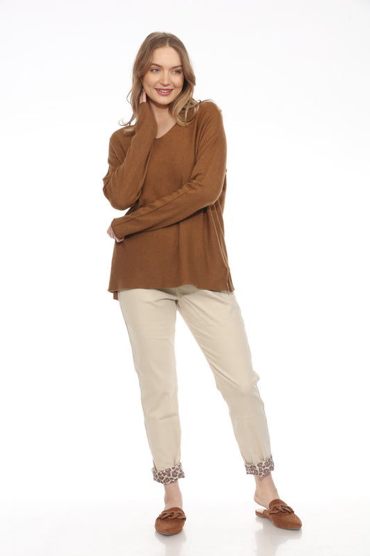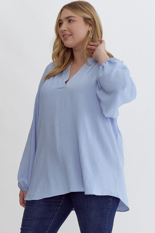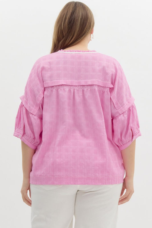 Light Pink Solid textured split v-neck under ruffled round neck pullover top