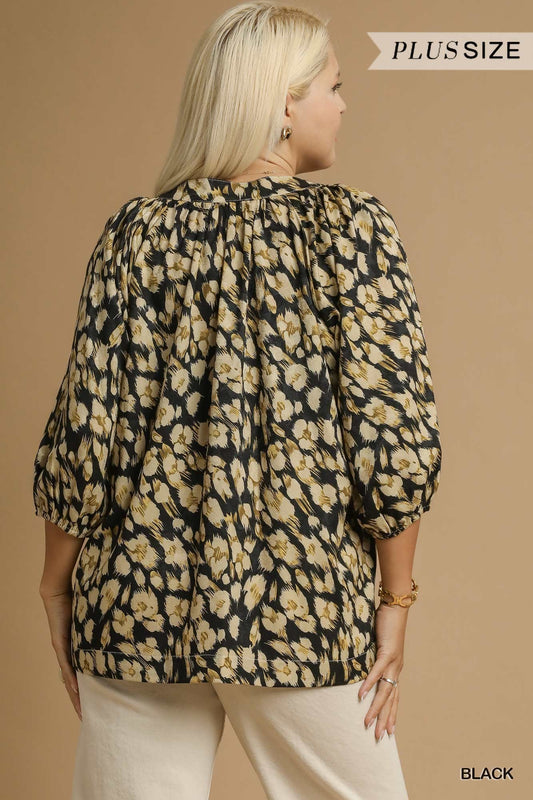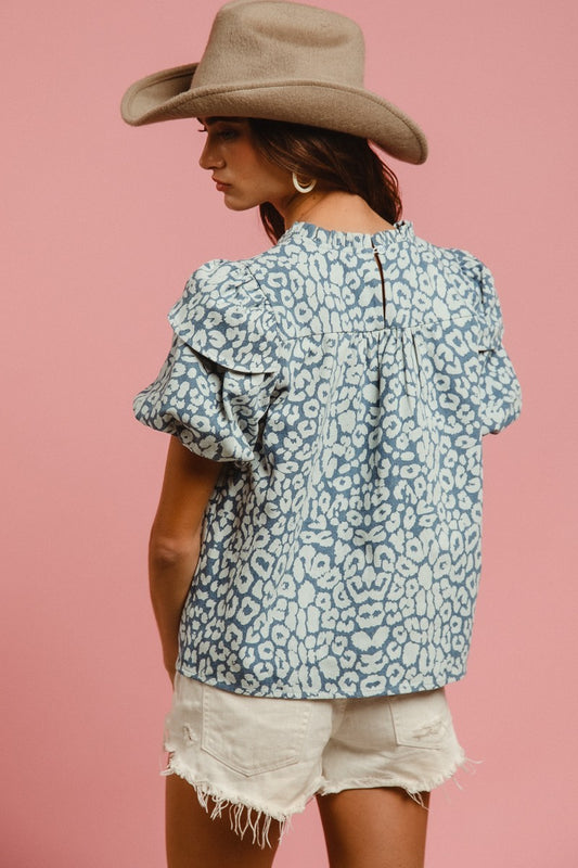 LEOPARD PRINT DENIM PUFF SLEEVES GATHERING NECK DETAIL TOP BACK KEYHOLE
