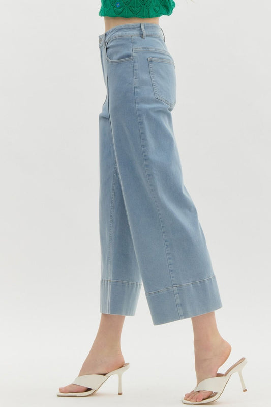 Light Denim Solid mid rise zip fly and button closure wide leg cuff ankle length pants.