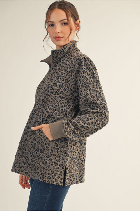 Mocha Long sleeves front zip up textured leopard top with pocket, side slit.