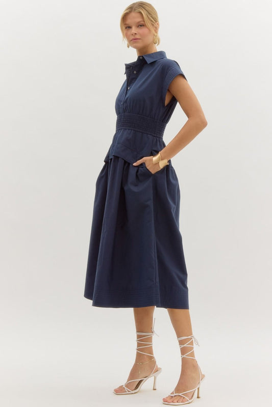 Navy Solid cap sleeve midi dress featuring smocked dress