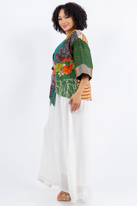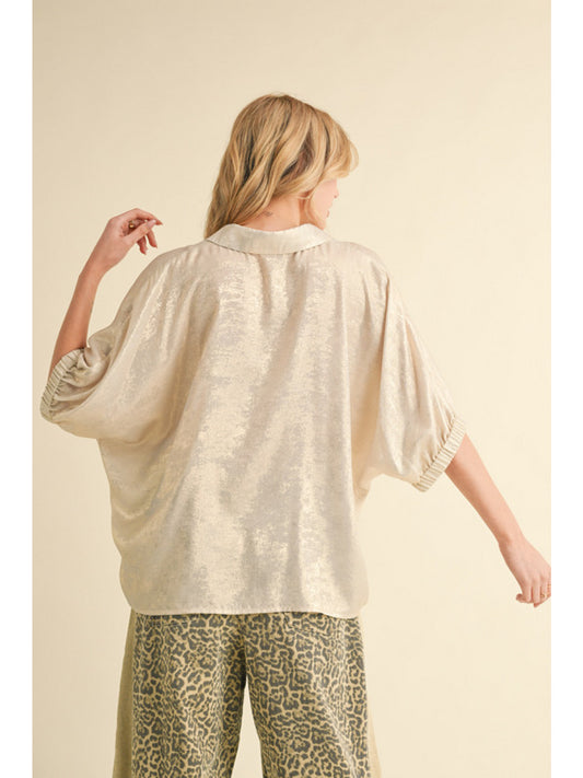 Pearl Metallic top with open collared neck, Half dolman sleeves, and stretch-band cuffs.