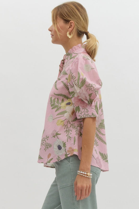 Pink Sage Floral print ruffled neck button top