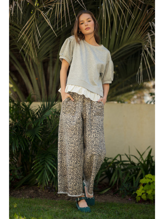 Plus leopard print pants with drawstring waistband, side pockets featuring fringe, and loose fit.