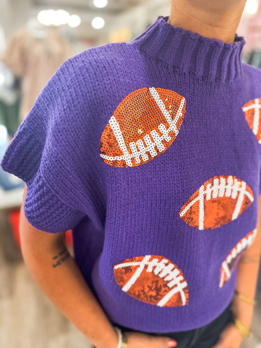 Purple Gameday Sequin Football Patches Rib Banded Sweater