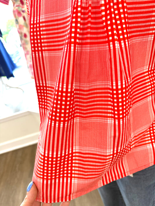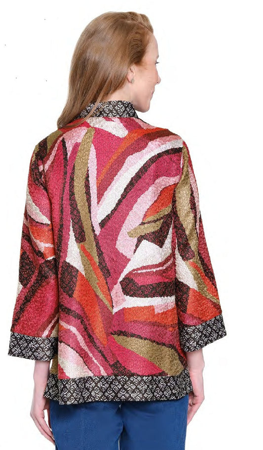 Red 3/4 sleeves 3D floral trim accent top, front pearl button, slit sleeves.