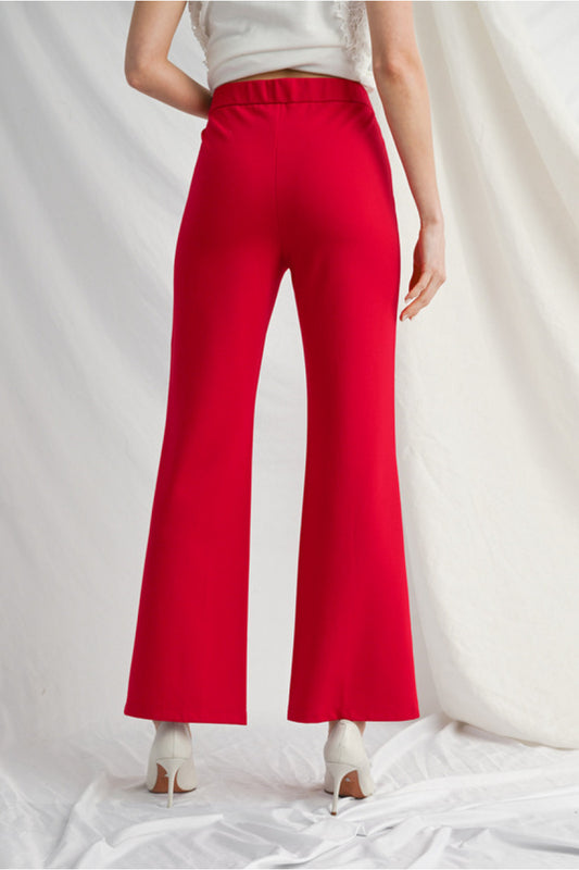 Red Solid bootcut slacks, one button closure, elastic waistband, slightly stretchable, side pockets.