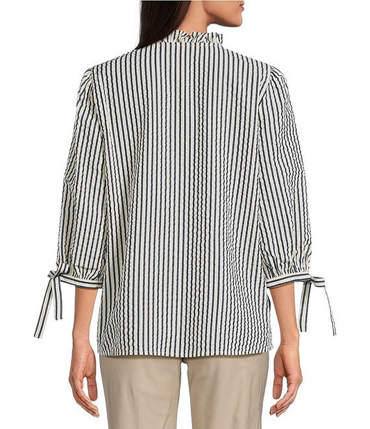 Woven Yarn-Dye Stripe Ruffle V-Neck 3/4 Tie Sleeve Blouse