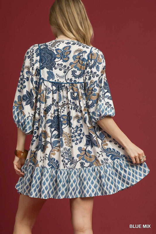 Blue Mixed Print Mini Dress