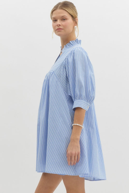 Blue Pinstripe v-neck button closure cuff ¾ puff sleeve mini dress
