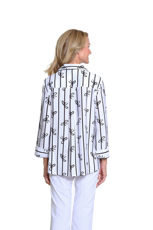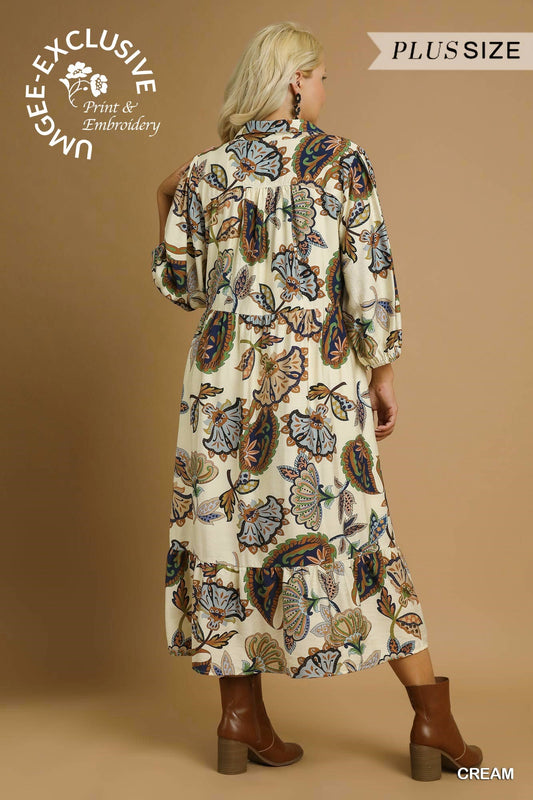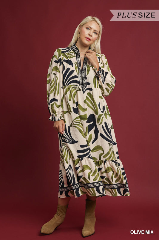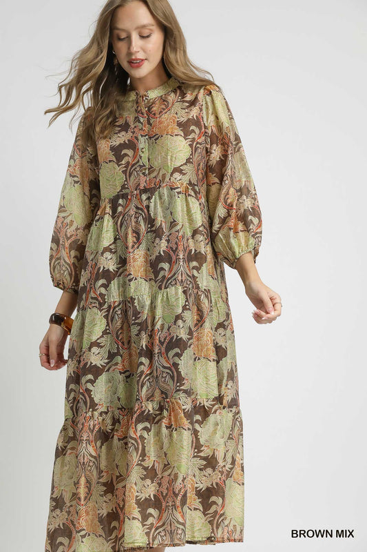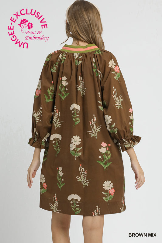 Brick Mix Long sleeves floral top with solid contrast detail, standing neckline.